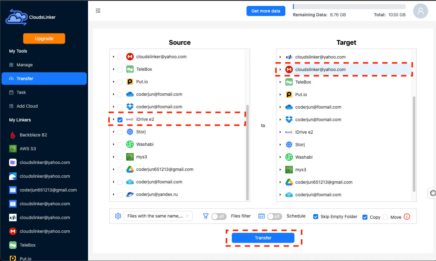 Begin the transfer process in CloudsLinker, allowing for a direct movement of files from IDrive E2 to Mega. The platform supports tracking the migration in real-time, ensuring transparency.