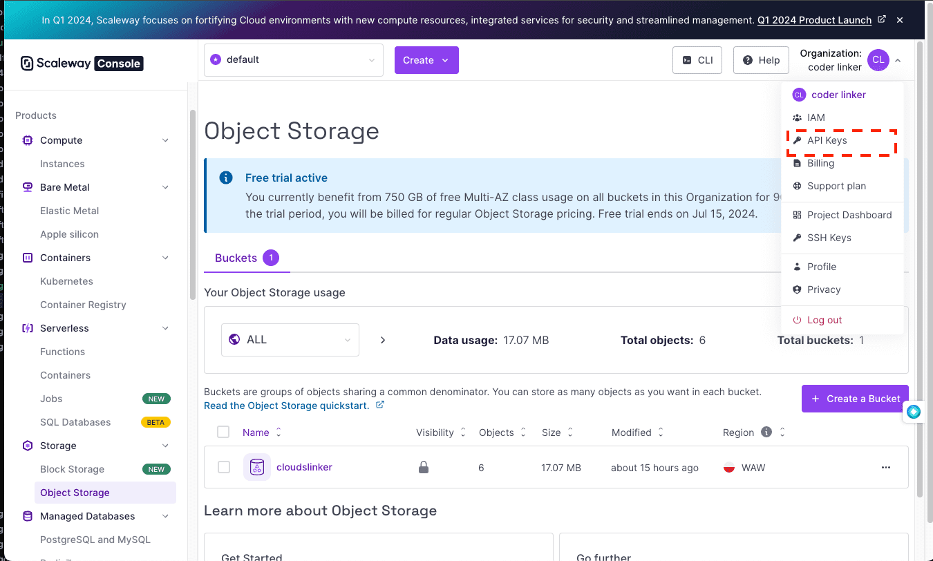 First, log into your Scaleway console to create and retrieve your API credentials. These credentials are essential for allowing CloudsLinker to interact with your Scaleway storage.