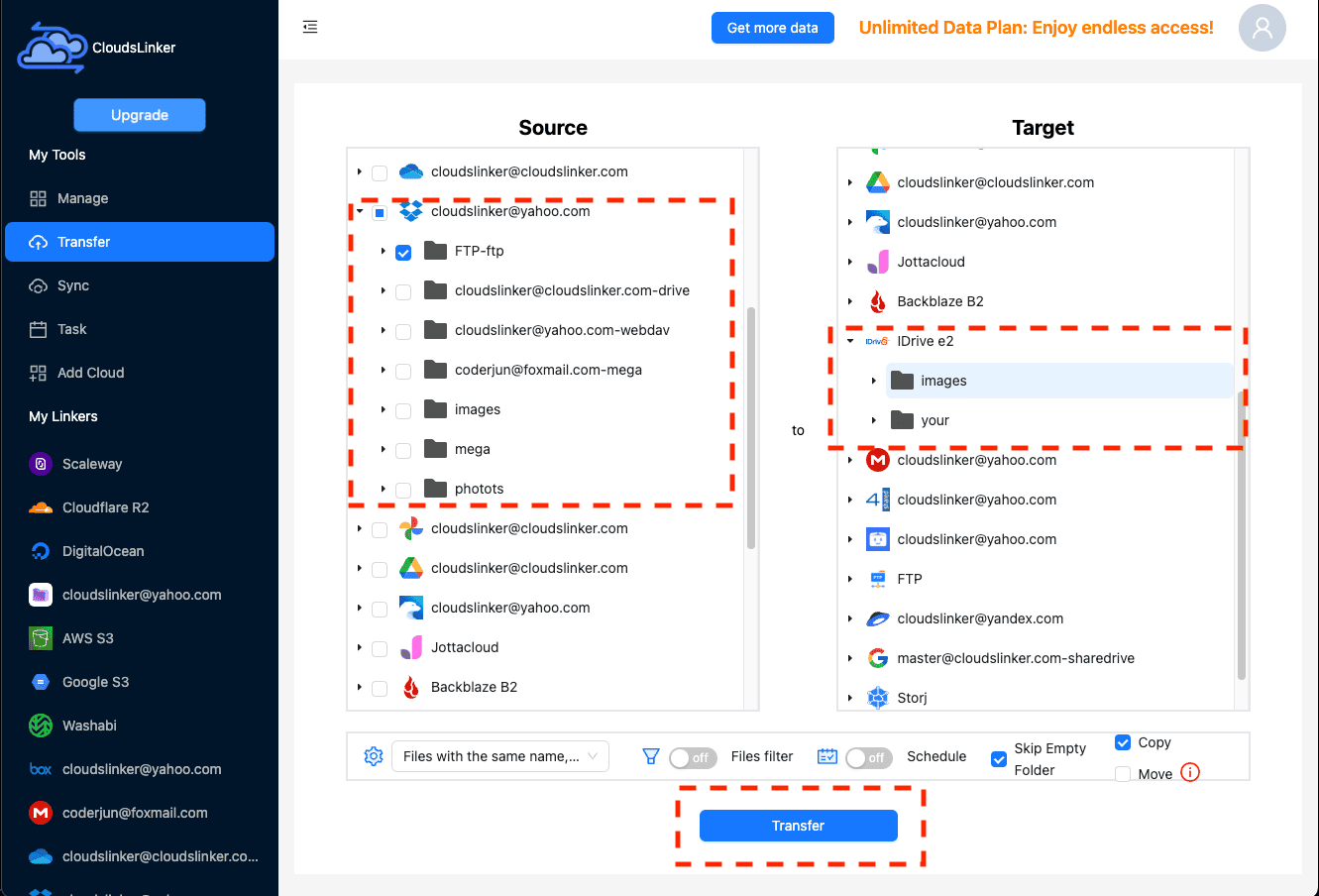 Transfer data between over 44 cloud services with CloudsLinker
